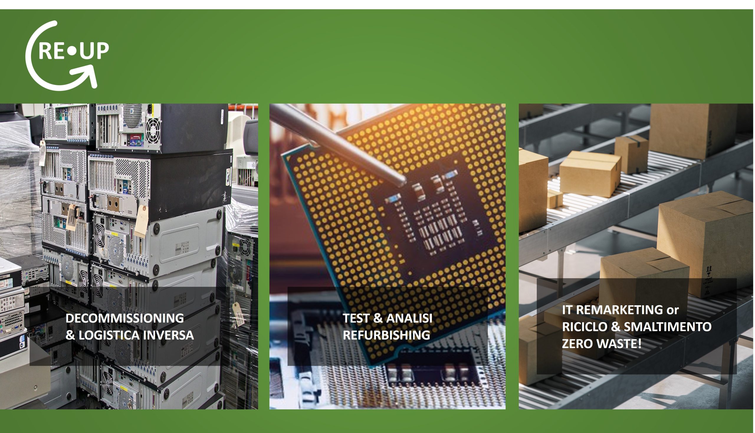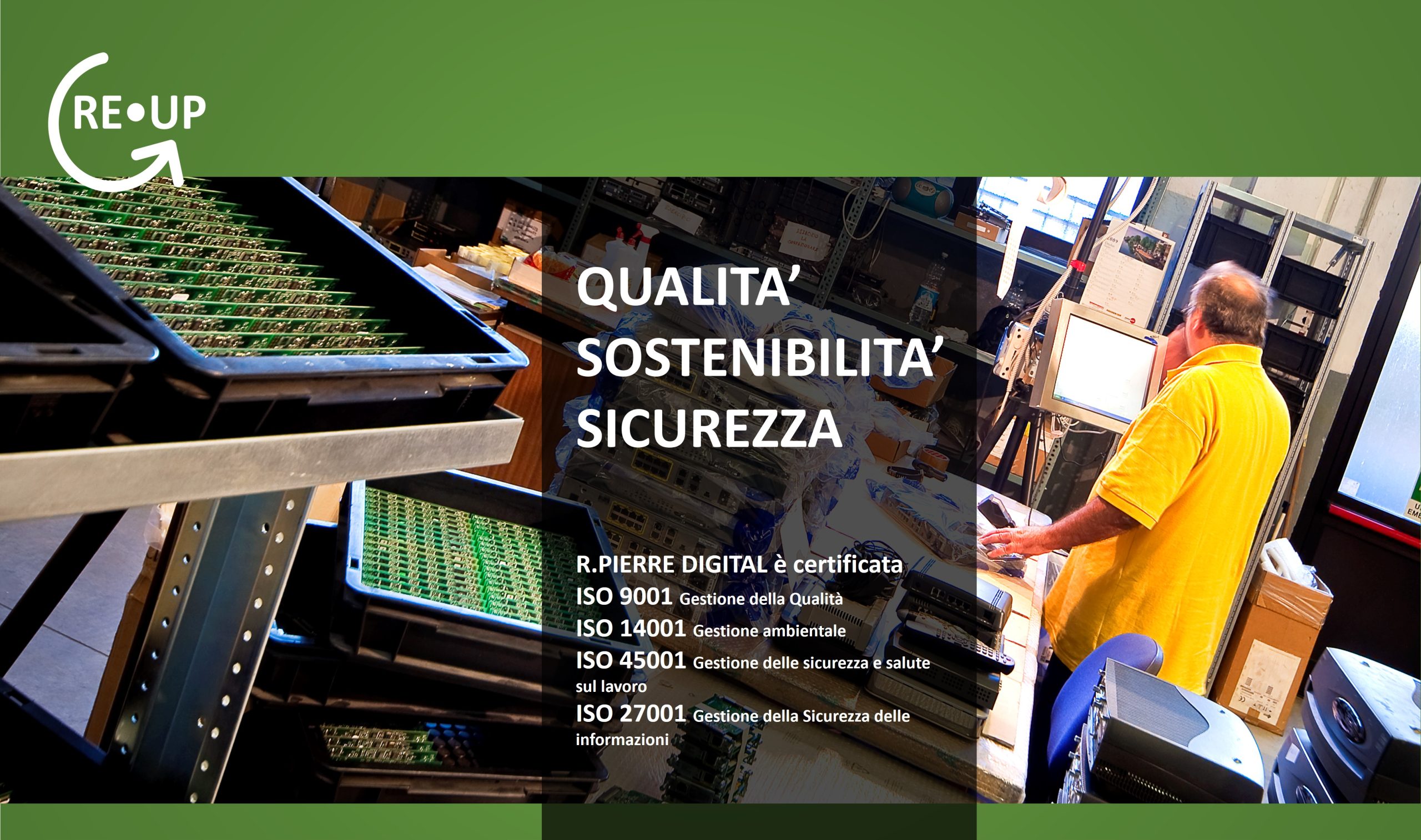 Abbiamo l’obiettivo ZERO RIFIUTI. Ogni prodotto o componente scartato diventa un prodotto come nuovo o materia prima per qualcosa di nuovo. R.Pierre Digital offre RE.UP e introduce la circolarità nel mondo dell’hardware e della tecnologia di rete.